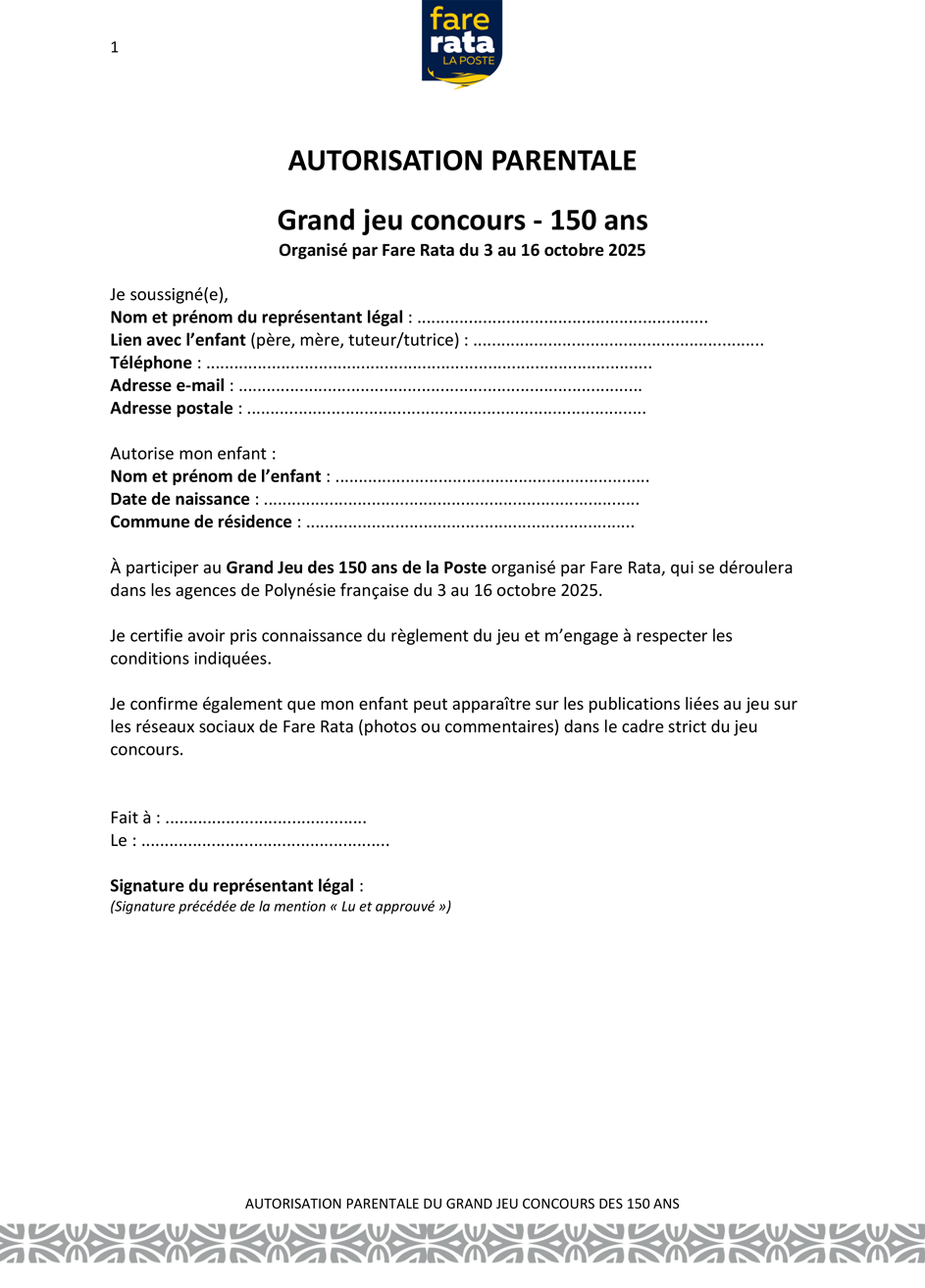 La SAS Fare Rata, SAS au capital de 3.675.000.000 F CFP dont le siège est situé au 8 rue de la Reine Pomare IV, 98714 Papeete, Tahiti, immatriculée au Registre du Commerce et des Sociétés de Papeete sous le n°TPI 18 358 B - N° TAHITI D01967. Fare Rata organise un jeu-concours gratuit sans obligation d’achat sur sa page Facebook officielle du 06 au 16 octobre 2025. L’objectif de cette opération est de célébrer cet anniversaire tout en valorisant les agences postales à travers toute la Polynésie française, en encourageant les usagers à redécouvrir ces lieux dans une ambiance ludique et intergénérationnelle.